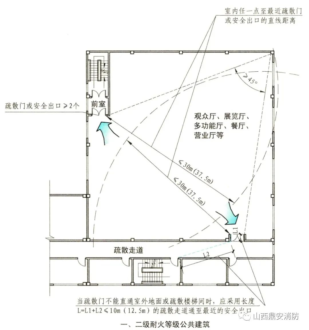 4.一、二级耐火等级建筑内疏散门或安全出口不少于2个的观众厅、展览厅、多功能厅、餐厅、营业厅等,其室内任一点至最近疏散门或安全出口的直线距离不应大于30m;当疏散门不能直通室外地面或疏散楼梯间时,应采用长度不大于10m的疏散走道通至最近的安全出口。当该场所设置自动喷水灭火系统时,室内任一点至最近安全出口的安全疏散距离可分别增加25%。
