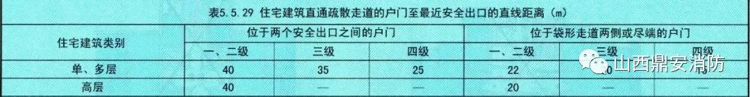 注:1 开向敞开式外廊的户门至最近安全出口的最大直线距离可按上表的规定增加5m。 2 直通疏散走道的户门至最近敞开楼梯间的直线距离,当户门位于两个楼梯间之间时,应按本表的规定减少5m;当户门位于袋形走道两侧或尽端时,应按上表的规定减少2m。 3 住宅建筑内全部设置自动喷水灭火系统时,其安全疏散距离可按上表的规定增加25%。 4 跃廊式住宅的户门至最近安全出口的距离,应从户门算起,小楼梯的一段距离可按其水平投影长度的1.50倍计算。 2.楼梯间应在首层直通室外,或在首层采用扩大的封闭楼梯间或防烟楼梯间前室。层数不超过4层时,可将直通室外的门设置在离楼梯间不大于15m处。 3.户内任一点至直通疏散走道的户门的直线距离不应大于上表规定的袋形走道两侧或尽端的疏散门至最近安全出口的最大直线距离。