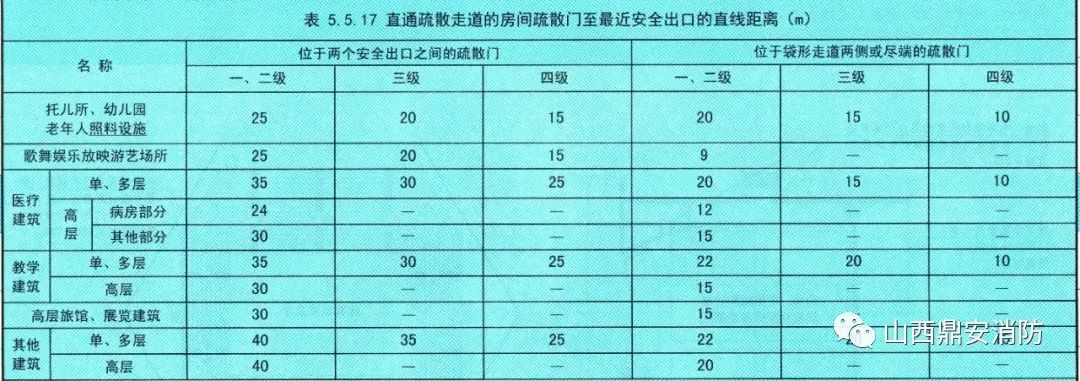 3. 房间内任一点至房间直通疏散走道的疏散门的直线距离,不应大于下表的规定。