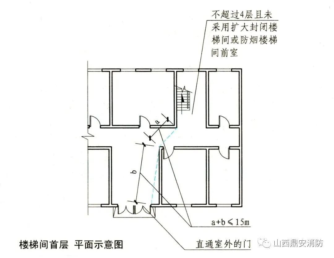 2. 楼梯间应在首层直通室外,确有困难时,可在首层采用扩大的封闭楼梯间或防烟楼梯间前室。当层数不超过4层且未采用扩大的封闭楼梯间或防烟楼梯间前室时,可将直通室外的门设置在离楼梯间不大于15m处。
