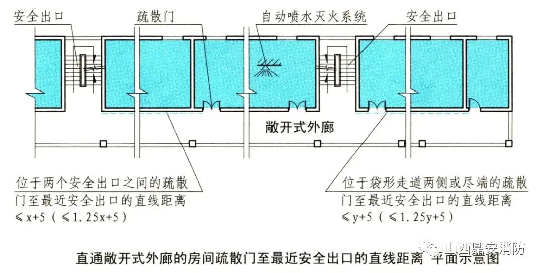 举例:如一设有敞开式外廊的多层办公楼,当未设置自动喷水灭火系统时,其位于两个安全出口之间的房间疏散门至最近安全出口的疏散距离为40+5=45(m);当设有自动喷水灭火系统时,该疏散距离可为40×(1+25%)+5=55(m)。即,对于一座全设置自动喷水灭火系统的建筑,且符合设置敞开式外廊或敞开楼梯间的要求时,其疏散距离是先增加25%后,再进行增减。3 敞开楼梯间在火灾时会变成烟气蔓延的主要通道,所以直通疏散走道的房间疏散门至最近敞开楼梯间的直线距离,当房间位于两个楼梯间之间时,应按上表的规定减少5m;当房间位于袋形走道两侧或尽端时,应按本表的规定减少2m。